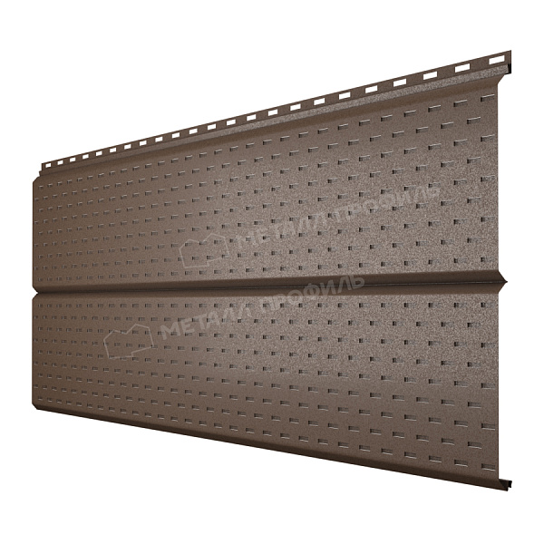 Софит — это специальные панели из серии Lбрус, оснащённые перфорацией на лицевой стороне. Они предназначены для подшивки карнизных свесов кровли. Благодаря аккуратному внешнему виду софит придаёт зданию завершённость и эстетическую целостность. Перфорированные отверстия обеспечивают вентиляцию подкровельного пространства, предотвращая скопление конденсата, а также развитие плесени и грибка.